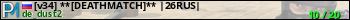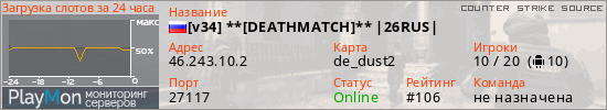 [v34] **[DEATHMATCH]** |26RUS| представлен в виде сервера ксс. Из всех имеющихся на сайте модификаций игровых серверов, наша система поставила метку DeathMatch сервера css. В нашем мониторинге игровых серверов вы так же можете найти быструю навигацию по всем меткам - используйте главную страницу игры Counter Strike Source.