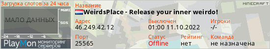 Общая информация ID: 49608 Ссылка: https://playmon.ru/server/46.249.42.12:25565 Версия: 1.18.1 Адрес: 46.249.42.12:25565 Игроки: 0/25 Статус: Выключен Владелец: Не определён