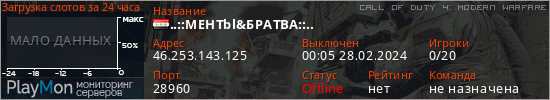 Общая информация ID: 60875 Ссылка: https://playmon.ru/server/46.253.143.125:28960 Адрес: 46.253.143.125:28960 Игроки: 0/20 Статус: Выключен Владелец: Не определён