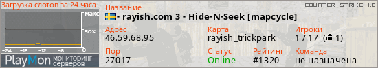 - rayish.com 3 - Hide-N-Seek [mapcycle] представлен в виде сервера кс 1.6. Из всех имеющихся на сайте модификаций игровых серверов, наша система поставила метку Hide'n'Seek сервера cs. В нашем мониторинге игровых серверов вы так же можете найти быструю навигацию по всем меткам - используйте главную страницу игры Counter Strike 1.6.