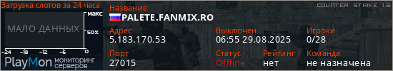 PALETE.FANMIX.RO представлен в виде сервера кс 1.6. Из всех имеющихся на сайте модификаций игровых серверов, вам может понравиться Hide'n'Seek серверы cs. А для быстрой навигации по всем меткам - используйте главную страницу игры Counter Strike 1.6.