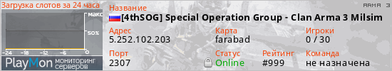 [4thSOG] Special Operation Group - Clan Arma 3 Milsim ITA представлен в виде сервера арма 3. Из всех имеющихся на сайте модификаций игровых серверов, вам может понравиться CUP серверы arma3. А для быстрой навигации по всем меткам - используйте главную страницу игры ARMA 3.