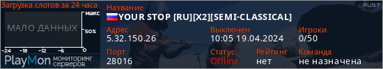 YOUR STOP [RU][X2][SEMI-CLASSICAL] представлен в виде сервера раст. Из всех имеющихся на сайте модификаций игровых серверов, вам может понравиться Kits серверы rust. А для быстрой навигации по всем меткам - используйте главную страницу игры Rust.