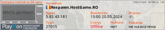 Respawn.HostGame.RO представлен в виде сервера кс 1.6. Из всех имеющихся на сайте модификаций игровых серверов, вам может понравиться Knife серверы cs. А для быстрой навигации по всем меткам - используйте главную страницу игры Counter Strike 1.6.