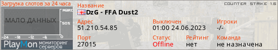 DzG - FFA Dust2 представлен в виде сервера кс 1.6. Из всех имеющихся на сайте модификаций игровых серверов, наша система поставила метку FFA сервера cs. В нашем мониторинге игровых серверов вы так же можете найти быструю навигацию по всем меткам - используйте главную страницу игры Counter Strike 1.6.