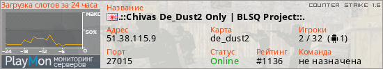 .::Chivas De_Dust2 Only | BLSQ Project::. представлен в виде сервера кс 1.6. Из всех имеющихся на сайте модификаций игровых серверов, вам может понравиться Hide'n'Seek серверы cs. А для быстрой навигации по всем меткам - используйте главную страницу игры Counter Strike 1.6.