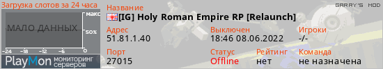 Общая информация ID: 47327 Ссылка: https://playmon.ru/server/51.81.1.40:27015 Адрес: 51.81.1.40:27015 Игроки: 0/64 Статус: Выключен Владелец: Не определён