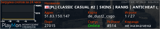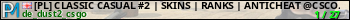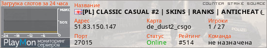 [PL] CLASSIC CASUAL #2 | SKINS | RANKS | ANTICHEAT @CSCO.pl представлен в виде сервера ксс. Из всех имеющихся на сайте модификаций игровых серверов, наша система поставила метку Classic сервера css. В нашем мониторинге игровых серверов вы так же можете найти быструю навигацию по всем меткам - используйте главную страницу игры Counter Strike Source.