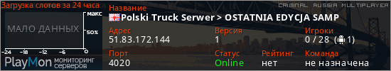 Общая информация ID: 65850 Ссылка: https://playmon.ru/server/51.83.172.144:4020 Версия: 1 Адрес: 51.83.172.144:4020 Игроки: 0/28 Боты: 1 Статус: Включен Владелец: Не определён