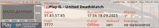 Общая информация ID: 65997 Ссылка: https://playmon.ru/server/51.83.57.85:7777 Версия: 0.3.7-R2 Адрес: 51.83.57.85:7777 Игроки: 0/500 Статус: Выключен Владелец: Не определён