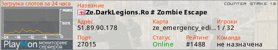 Ze.DarkLegions.Ro # Zombie Escape представлен в виде сервера кс 1.6. Из всех имеющихся на сайте модификаций игровых серверов, наша система поставила метку Zombie сервера cs. В нашем мониторинге игровых серверов вы так же можете найти быструю навигацию по всем меткам - используйте главную страницу игры Counter Strike 1.6.