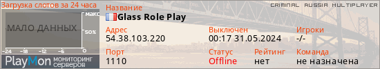 Общая информация ID: 61349 Ссылка: https://playmon.ru/server/54.38.103.220:1110 Версия: 0.3.7-R2 Адрес: 54.38.103.220:1110 Игроки: 0/100 Статус: Выключен Владелец: Не определён