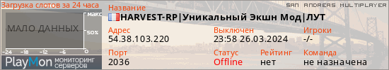 Общая информация ID: 61444 Ссылка: https://playmon.ru/server/54.38.103.220:2036 Версия: 0.3.7-R2 Адрес: 54.38.103.220:2036 Игроки: 0/500 Статус: Выключен Владелец: Не определён