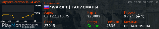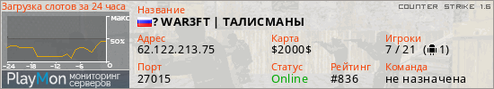 ? WAR3FT | ТАЛИСМАНЫ представлен в виде сервера кс 1.6. Из всех имеющихся на сайте модификаций игровых серверов, наша система поставила метку War3FT сервера cs. В нашем мониторинге игровых серверов вы так же можете найти быструю навигацию по всем меткам - используйте главную страницу игры Counter Strike 1.6.