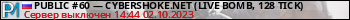 PUBLIC #60 — CYBERSHOKE.NET (LIVE BOMB, 128 TICK) представлен в виде сервера кс го. Из всех имеющихся на сайте модификаций игровых серверов, вам может понравиться Retake серверы csgo. А для быстрой навигации по всем меткам - используйте главную страницу игры Counter Strike Global Offensive.
