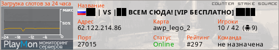 ██ | VS |██ ВСЕМ СЮДА! [VIP БЕСПЛАТНО] ████ представлен в виде сервера ксс. Из всех имеющихся на сайте модификаций игровых серверов, вам может понравиться GunGame серверы css. А для быстрой навигации по всем меткам - используйте главную страницу игры Counter Strike Source.