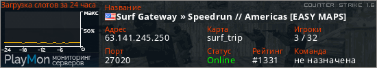 Surf Gateway » Speedrun // Americas [EASY MAPS] представлен в виде сервера кс 1.6. Из всех имеющихся на сайте модификаций игровых серверов, наша система поставила метку Surf сервера cs. В нашем мониторинге игровых серверов вы так же можете найти быструю навигацию по всем меткам - используйте главную страницу игры Counter Strike 1.6.