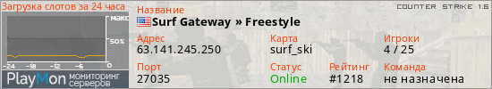 Surf Gateway » Freestyle представлен в виде сервера кс 1.6. Из всех имеющихся на сайте модификаций игровых серверов, наша система поставила метку Surf сервера cs. В нашем мониторинге игровых серверов вы так же можете найти быструю навигацию по всем меткам - используйте главную страницу игры Counter Strike 1.6.