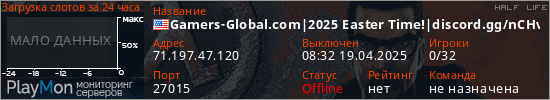 Общая информация ID: 67990 Ссылка: https://playmon.ru/server/71.197.47.120:27015 Адрес: 71.197.47.120:27015 Игроки: 0/32 Статус: Выключен Владелец: Не определён