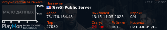 Общая информация ID: 67169 Ссылка: https://playmon.ru/server/73.176.184.48:27030 Адрес: 73.176.184.48:27030 Игроки: 0/4 Статус: Выключен Владелец: Не определён