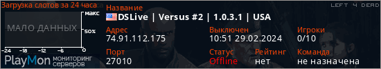 Общая информация ID: 56032 Ссылка: https://playmon.ru/server/74.91.112.175:27010 Адрес: 74.91.112.175:27010 Игроки: 0/10 Статус: Выключен Владелец: Не определён