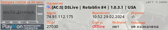 Общая информация ID: 56061 Ссылка: https://playmon.ru/server/74.91.112.175:27030 Адрес: 74.91.112.175:27030 Игроки: 0/14 Статус: Выключен Владелец: Не определён