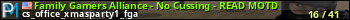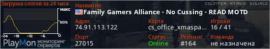 Family Gamers Alliance - No Cussing - READ MOTD представлен в виде сервера ксс. Из всех имеющихся на сайте модификаций игровых серверов, вам может понравиться DeathMatch серверы css. А для быстрой навигации по всем меткам - используйте главную страницу игры Counter Strike Source.