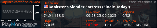 Dookster's Slender Fortress (Finale Today!) представлен в виде сервера тф2. Из всех имеющихся на сайте модификаций игровых серверов, вам может понравиться DeathRun серверы tf2. А для быстрой навигации по всем меткам - используйте главную страницу игры Team Fortress 2.
