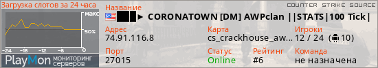 ███► CORONATOWN [DM] AWPclan ||STATS|100 Tick|BHOP ON| представлен в виде сервера ксс. Из всех имеющихся на сайте модификаций игровых серверов, наша система поставила метку DeathMatch сервера css. В нашем мониторинге игровых серверов вы так же можете найти где поиграть на AWP сервере ксс.
