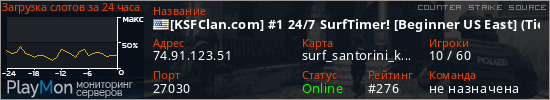 [KSFClan.com] #1 24/7 SurfTimer! [Beginner US East] (Tiers 1-2) представлен в виде сервера ксс. Из всех имеющихся на сайте модификаций игровых серверов, наша система поставила метку Surf сервера css. В нашем мониторинге игровых серверов вы так же можете найти быструю навигацию по всем меткам - используйте главную страницу игры Counter Strike Source.