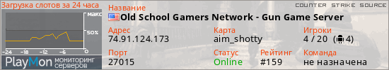 Old School Gamers Network - Gun Game Server представлен в виде сервера ксс. Из всех имеющихся на сайте модификаций игровых серверов, наша система поставила метку GunGame сервера css. В нашем мониторинге игровых серверов вы так же можете найти быструю навигацию по всем меткам - используйте главную страницу игры Counter Strike Source.