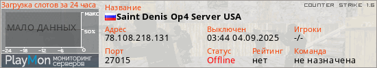 Saint Denis Op4 Server USA представлен в виде сервера кс 1.6. Из всех имеющихся на сайте модификаций игровых серверов, вам может понравиться DeathRun серверы cs. А для быстрой навигации по всем меткам - используйте главную страницу игры Counter Strike 1.6.