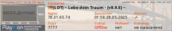 Общая информация ID: 65681 Ссылка: https://playmon.ru/server/78.31.65.74:7777 Версия: 1.4.0.2783 Адрес: 78.31.65.74:7777 Игроки: 0/500 Статус: Выключен Владелец: Не определён
