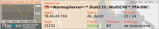 -=WarmupServer=-™ Dust2 23 ★MultiCFG™★FFA-DM★ представлен в виде сервера кс 2. Из всех имеющихся на сайте модификаций игровых серверов, наша система поставила метку DeathMatch сервера cs2. В нашем мониторинге игровых серверов вы так же можете найти где поиграть на FFA сервере кс 2.
