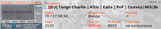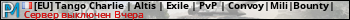 [EU] Tango Charlie | Altis | Exile | PvP | Convoy|Mili|Bounty| представлен в виде сервера арма 3. Из всех имеющихся на сайте модификаций игровых серверов, наша система поставила метку Exile сервера arma3. В нашем мониторинге игровых серверов вы так же можете найти быструю навигацию по всем меткам - используйте главную страницу игры ARMA 3.
