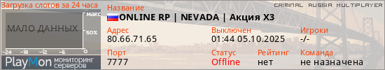 Общая информация ID: 65729 Ссылка: https://playmon.ru/server/80.66.71.65:7777 Версия: 0.3.7-R2 Адрес: 80.66.71.65:7777 Игроки: 0/1000 Статус: Выключен Владелец: Не определён