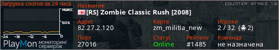 [RS] Zombie Classic Rush [2008] представлен в виде сервера кс 1.6. Из всех имеющихся на сайте модификаций игровых серверов, наша система поставила метку Zombie сервера cs. В нашем мониторинге игровых серверов вы так же можете найти где поиграть на Classic сервере кс 1.6.