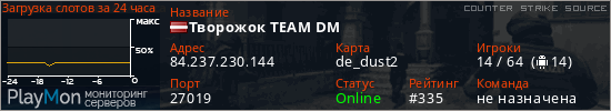 Творожок TEAM DM представлен в виде сервера ксс. Из всех имеющихся на сайте модификаций игровых серверов, наша система поставила метку DeathMatch сервера css. В нашем мониторинге игровых серверов вы так же можете найти быструю навигацию по всем меткам - используйте главную страницу игры Counter Strike Source.