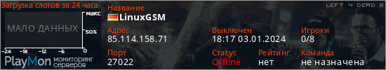 Общая информация ID: 60190 Ссылка: https://playmon.ru/server/85.114.158.71:27022 Адрес: 85.114.158.71:27022 Игроки: 0/8 Статус: Выключен Владелец: Не определён