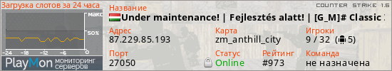 Under maintenance! | Fejlesztés alatt! | [G_M]# Classic Zombie Server @ gmgaming.hu представлен в виде сервера кс 1.6. Из всех имеющихся на сайте модификаций игровых серверов, наша система поставила метку Zombie сервера cs. В нашем мониторинге игровых серверов вы так же можете найти где поиграть на Classic сервере кс 1.6.