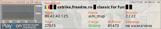 █ █ cstrike.freedns.ro █ classic for fun █ █ представлен в виде сервера кс 1.6. Из всех имеющихся на сайте модификаций игровых серверов, наша система поставила метку Classic сервера cs. В нашем мониторинге игровых серверов вы так же можете найти быструю навигацию по всем меткам - используйте главную страницу игры Counter Strike 1.6.