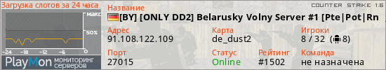 [BY] [ONLY DD2] Belarusky Volny Server #1 [Pte|Pot|Rnd] представлен в виде сервера кс 1.6. Из всех имеющихся на сайте модификаций игровых серверов, вам может понравиться Hide'n'Seek серверы cs. А для быстрой навигации по всем меткам - используйте главную страницу игры Counter Strike 1.6.