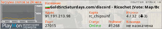 GoldSrcSaturdays.com/discord - Ricochet [Vote: Map/Bots] представлен в виде сервера кс 1.6. Из всех имеющихся на сайте модификаций игровых серверов, вам может понравиться Knife серверы cs. А для быстрой навигации по всем меткам - используйте главную страницу игры Counter Strike 1.6.