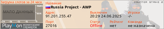 Russia Project - AWP представлен в виде сервера кс 2. Из всех имеющихся на сайте модификаций игровых серверов, наша система поставила метку AWP сервера cs2. В нашем мониторинге игровых серверов вы так же можете найти быструю навигацию по всем меткам - используйте главную страницу игры Counter Strike 2.