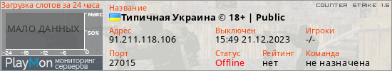 Общая информация ID: 55827 Ссылка: https://playmon.ru/server/91.211.118.106:27015 Адрес: 91.211.118.106:27015 Игроки: 0/32 Статус: Выключен Владелец: Не определён