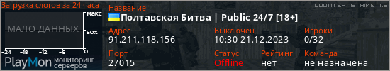 Полтавская Битва | Public 24/7 [18+] представлен в виде сервера кс 1.6. Из всех имеющихся на сайте модификаций игровых серверов, вам может понравиться Hide'n'Seek серверы cs. А для быстрой навигации по всем меткам - используйте главную страницу игры Counter Strike 1.6.