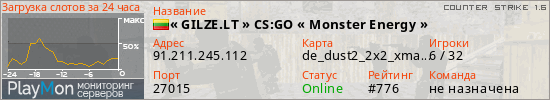 « GILZE.LT » CS:GO « Monster Energy » представлен в виде сервера кс 1.6. Из всех имеющихся на сайте модификаций игровых серверов, вам может понравиться Hide'n'Seek серверы cs. А для быстрой навигации по всем меткам - используйте главную страницу игры Counter Strike 1.6.