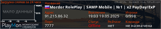 Общая информация ID: 65912 Ссылка: https://playmon.ru/server/91.215.86.32:7777 Версия: 0.3.7-R2 Адрес: 91.215.86.32:7777 Игроки: 0/998 Статус: Выключен Владелец: Не определён
