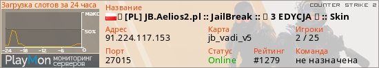 ★ [PL] JB.Aelios2.pl :: JailBreak :: ★ 3 EDYCJA ★ :: Skin представлен в виде сервера кс 2. Из всех имеющихся на сайте модификаций игровых серверов, наша система поставила метку JailBreak сервера cs2. В нашем мониторинге игровых серверов вы так же можете найти быструю навигацию по всем меткам - используйте главную страницу игры Counter Strike 2.