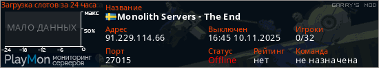 Общая информация ID: 66165 Ссылка: https://playmon.ru/server/91.229.114.66:27015 Адрес: 91.229.114.66:27015 Игроки: 0/32 Статус: Выключен Владелец: Не определён